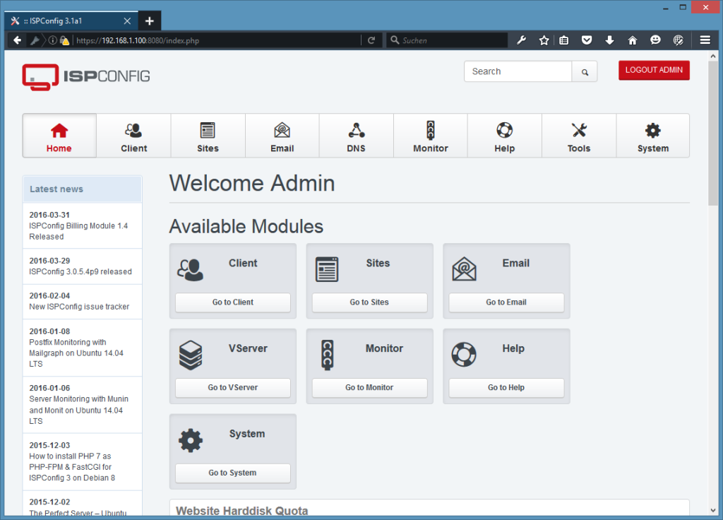 Log in to the ISPConfig interface using your browser. Use the server’s IP address or domain name, followed by port 8080, such as http://your-server-ip:8080. Enter the default credentials you set during installation.